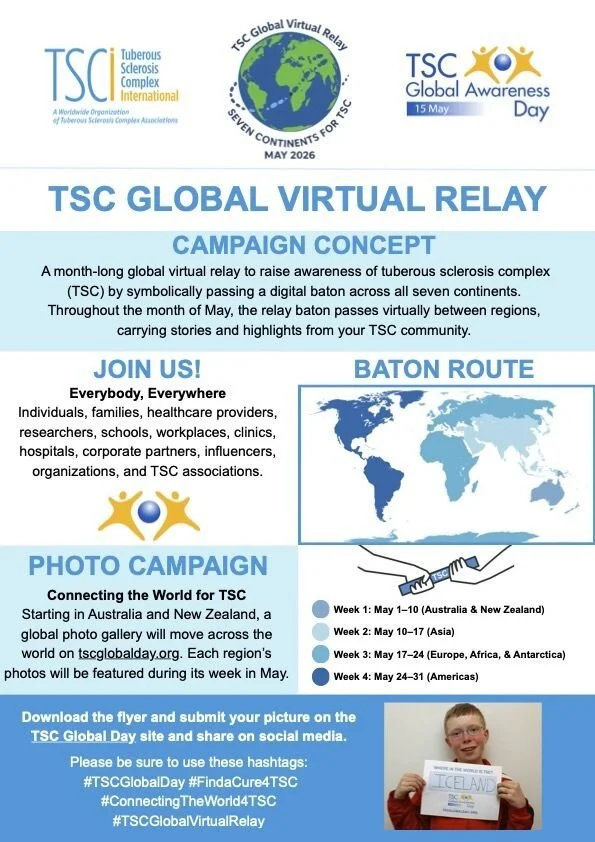 Join TSCIreland and TSCi for a month-long global virtual relay to raise awareness of tuberous sclerosis complex (TSC) by symbolically passing a digital baton across all seven continents. Throughout the month of May, the relay baton passes virtually between regions, carrying stories and highlights from your TSC community.